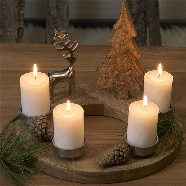 Der längliche Kerzenständer in Champagner-Gold ist ein wahres Highlight auf jeder Festtafel. Seine vier Kerzenhalter schweben förmlich über dem Tablett. Zusätzlich sorgen glitzernde weiße oder graue Weihnachtskugeln aus Glas für einen edlen Touch. Möchten Sie dieses Arrangement farblich und stilistisch etwas aufbrechen, dann sorgen Tannenzapfen für eine natürliche Stimmung. Holz gepaart mit natürlichen und glänzenden Weihnachtselementen – das ist „Soft Metallics“. Mit dem Kerzenkranz aus Holz, auf dem es sich ein silberfarbener Hirsch und ein Bäumchen aus Holz gemütlich gemacht haben, zieht eine verträumte Waldlandschaft bei Ihnen ein.